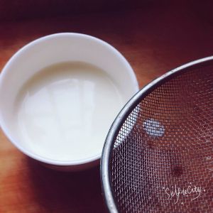 将奶皮轻轻挑起,将奶沿边缘缓慢倒入容器