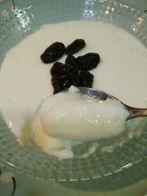 蒸好后撕掉保鲜膜晾凉,会结一层奶皮;