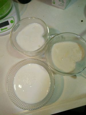 先将蛋黄和蛋清分离(有专业的分离器),在蛋清中加入白糖打散。蒸锅水开后,放入牛奶蒸几分钟,冷却后,有一层奶皮浮在上面。用小刀沿着奶皮边缘割开一道10厘米的口子。