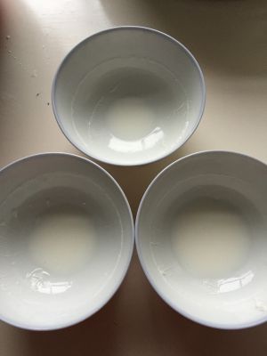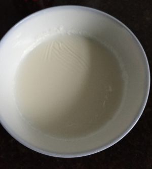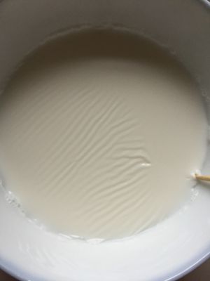 将碗中的牛奶倒入另一个容器中,碗底留一些牛奶,以防粘皮。(可以看到碗边缘粘的奶皮)接着将打散的蛋清倒入另一个容器的牛奶中,搅拌均匀。