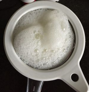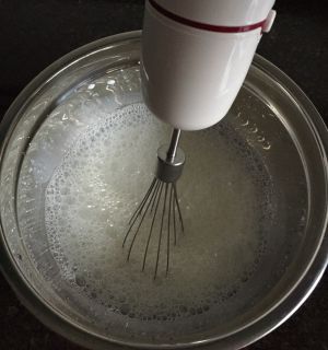 用打蛋器将蛋白、细砂糖和倒出的牛奶快速搅打均匀;