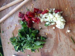 大蒜拍一下切碎,香菜切碎(根不要只要菜),米椒切小段,