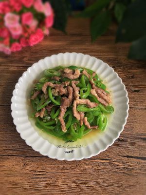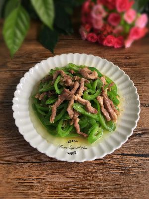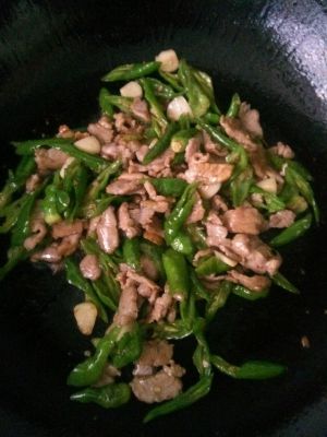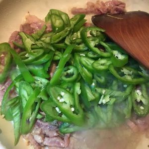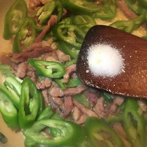 炒至肉丝颜色微变,倒入青椒不停翻炒。