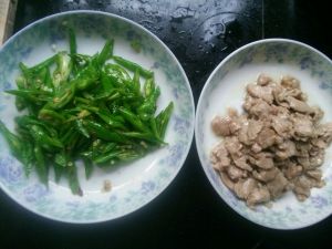 青椒炒好盛出备用,瘦肉烧好盛出备用