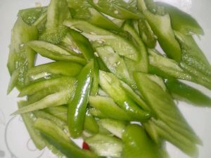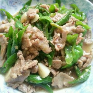 准备好材料,青椒切丝,瘦肉切片(用淀粉、一点盐、一点酱油抓匀),剥好大蒜