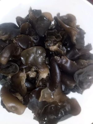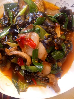 然后下木耳、蒜苗茎、青椒适量的盐、生抽、不停的翻炒至蒜苗断生、关小火、下蒜苗叶翻炒均匀、放适量的鸡精、十三香。