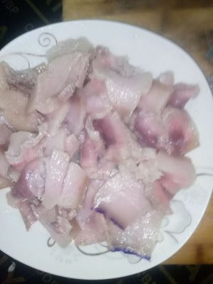 先将五花肉去毛洗净、放入冷水锅、大火烧开、下花椒、转中火煮五分钟、用筷子能够穿皮就可以了、捞出五花肉用凉水洗下,皮朝下、把五花肉切薄片。