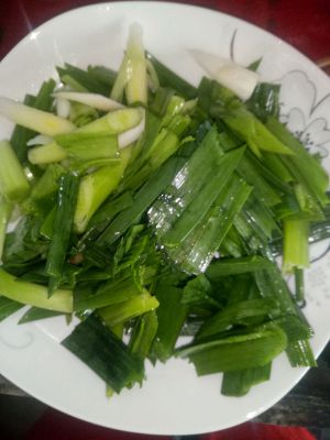 蒜苗切成斜段、茎、叶、分开、因为成熟的时间不同。