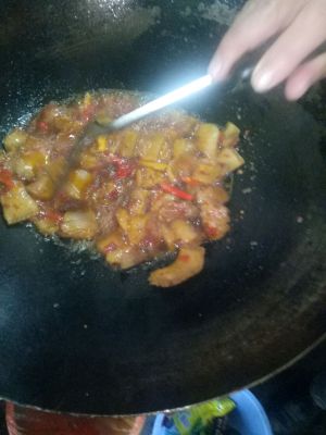 加上青椒翻炒炒到自己喜欢的软硬程度哦最后再加上点味精或者鸡精提鲜哦