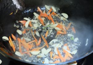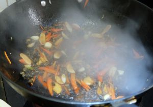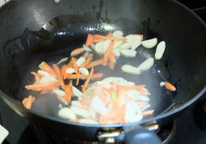 炒锅上火烧热,放油,放入大蒜片、葱花炒香,然后放进胡萝卜翻炒一下;