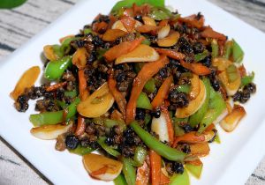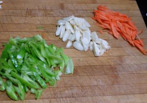 把青椒、胡萝卜、大蒜分别切好;还有一个葱白也切成葱花,忘记拍照了;