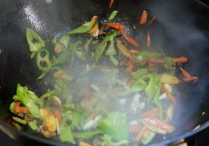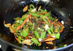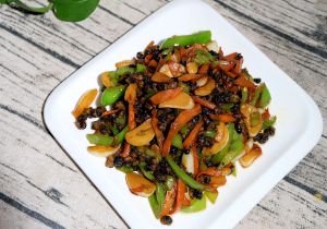 放入切好的青椒,再放些盐调味,继续翻炒几下就可以了;