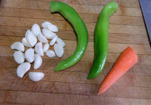 大蒜去皮,青椒去蒂,胡萝卜去皮;因为我家人不能吃辣,所以我选的是辣味不重的青椒,配了很多的大蒜,如果喜欢吃辣的,可以放点干红辣椒或者把青椒换成辣味重的;