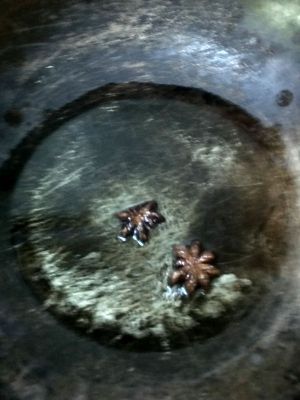 小火倒入底油放两个大料,待油热出香味后将热油倒入上劲的肉馅中