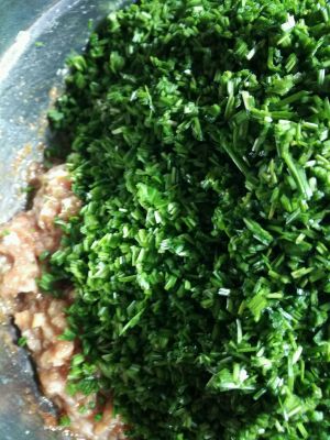 将切好的韭菜放入已和好的肉馅中