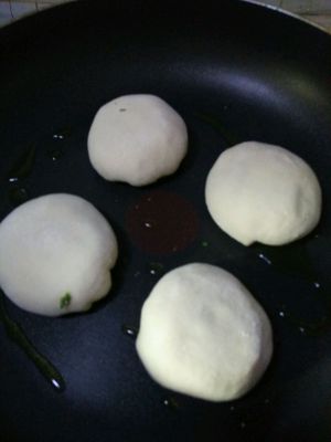 擀好的饼皮装入馅料,包成包子装,按成或者擀成饼状,放入锅中,如果没有刷油的刷子,就在刚放入锅中的时候翻一下