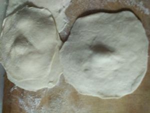 醒好的面切大剂擀成中间厚一点的饼皮。