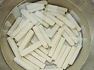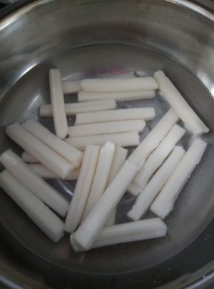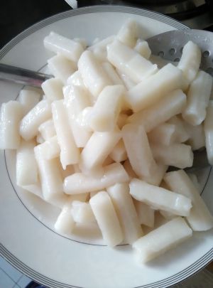 将年糕条下锅里煮,大约煮到年糕体力变大捞出待用。