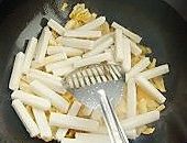 放入年糕,翻炒均匀,小心不要弄碎。