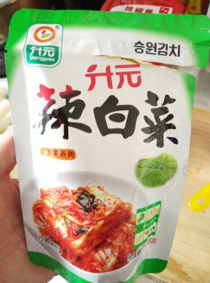 辣白菜切片待用。我用的这种,因为本身是切片,我也没再加工。如果是整棵的,要切成小片。