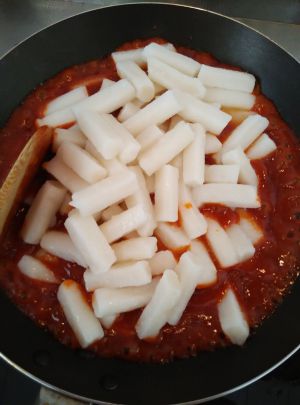 将煮好的年糕条慢慢倒入辣酱锅内,用木铲轻轻翻炒,至酱料均匀包裹在年糕条上。然后再次加些清水翻炒均匀(如果酱料不稠此步加水可以不加)。