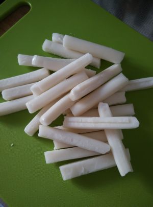 我用的是火锅年糕,超市里就可买到。半袋,就是250克。用手分开成独立的条条。为了能让年糕条更好的入味,可以截至1/2的长短。