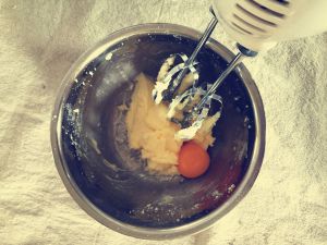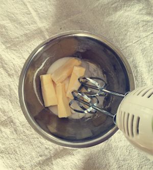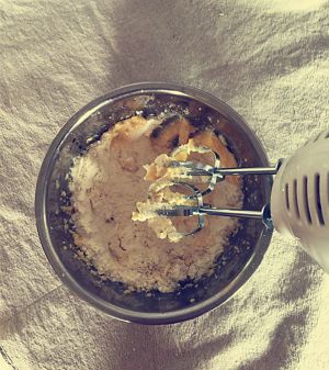 将室温下软化的黄油加入砂糖,搅拌均匀,我这里用的是电动打蛋器,其实用蛋抽打也是可以的,搅匀就行