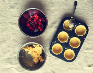 将派馅材料填满派皮,并在表面压上几个樱桃