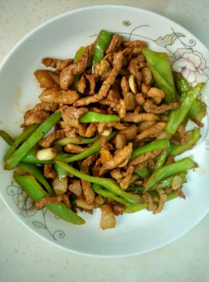 最后放入青椒,芹菜,鸡精炒均匀就ok了,装盘。
