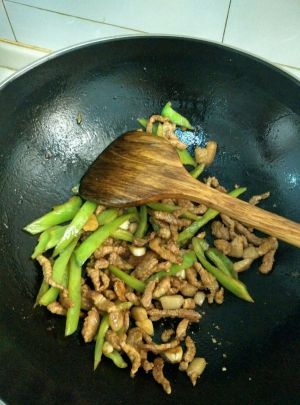 再倒油,油热后把腌好的肉片倒入锅内快速翻炒,炒至变色后把青椒木耳倒进去一起炒,加盐,加鸡精翻炒几下出锅。行了,开吃吧