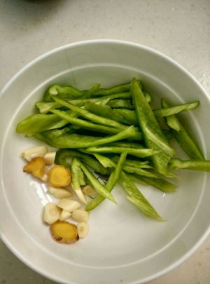 姜切丝,青椒切成块备用,猪肉切薄片加生粉、酱油拌匀