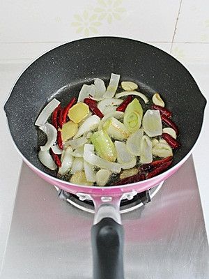 锅内放油烧热,放入花椒炸出香味,然后捞出花椒。