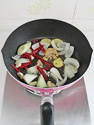 锅里加油,放入干辣椒、洋葱、大葱、蒜、姜、绿麻椒粒和大块鸡油,中小火煸炒至鸡油完全吐油、表面微焦。