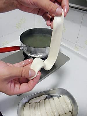 饧好的面剂子用手捏住两头将其抻成厚度合适的宽面。