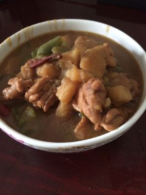 2锅里放油,热了把鸡肉倒进去煸炒,然后放水,放大料,料酒,干辣椒,放一部分盐入味,放酱油,面酱上色。把土豆放进去,等差不多快熟了再把青椒放进去,最后再加另一部分盐,味精,最后肉熟了,收收汤汁,出锅。