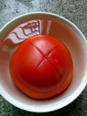 我不喜欢吃皮,在西红柿划十字,泡上开水1分钟