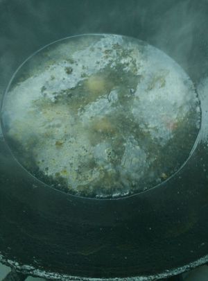 倒入适量热水,然后把除鱼片以外的鱼骨都放入锅内炖一小会儿,