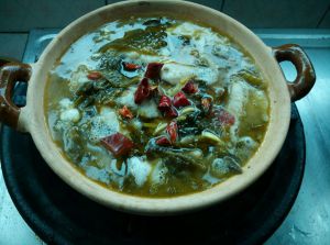调好味再将酸菜稍煮几分钟后捞出放入预热好的砂锅内(砂锅冬天使用保温性好),将2中的鱼片下入酸菜鱼汤中氽烫至变色,连汤带鱼片倒入铺底有酸菜的砂锅内;