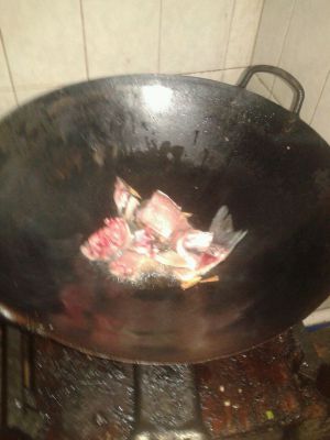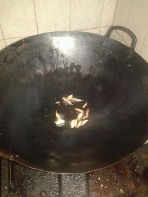 翻到另一面煎同时酸菜泡椒蒜放进去翻动。慢慢翻否则鱼骨会散