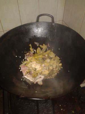 锅内倒入油和料包翻炒,放入酸菜,炒出香味