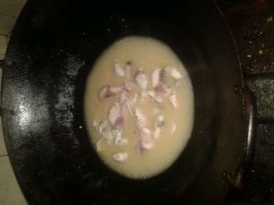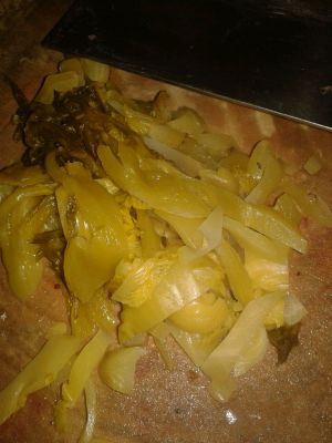 锅内放油加热,放葱姜蒜,酸菜包,辣椒包,翻炒。