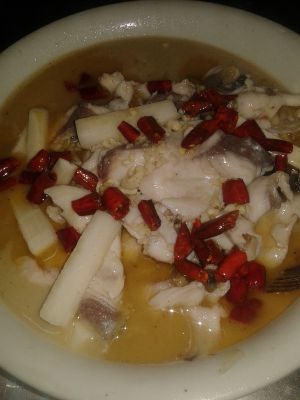 最后一道程序挺重要的。我这里是放了酸萝卜,因为是家庭版所以我觉得没必要专门去泡,当然市场上也有卖的,如果你觉得放酸萝卜味道比较好,就跟酸菜一起下锅。把干辣椒节蒜米放到鱼片上面,然后淋油油的温度一定要高。才能把蒜味干辣椒的味炸出来。