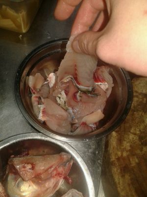 放入鱼头、鱼尾、鱼骨,倒入水,没过鱼头即可,煮开
