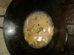 鱼片先腌好再来做菜。把鱼骨酸菜打捞放进盆里。留下汤。