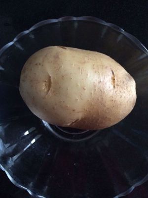 准备土豆一个,去皮切丁,洗去上面的淀粉,放入微波炉叮8分钟,使其变软,用勺子捣成土豆泥