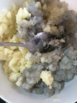 将虾泥和土豆泥混合放入适量盐,搅拌均匀,搓成球状