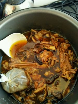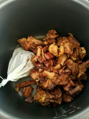 鸡腿洗净切块,锅内加油爆葱姜蒜,加鸡肉加老抽,胡椒粉炒熟,放到高压锅里,其他干料放入纸袋系好,有现成的炖鸡料就更好了,比较方便。