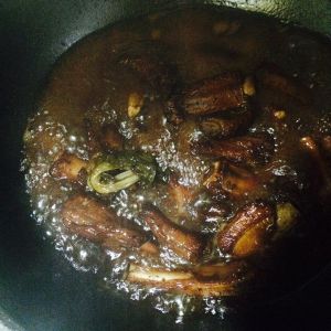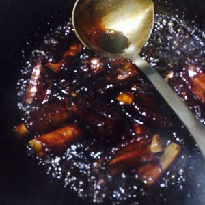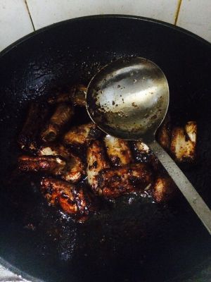 带排骨微微变色后加入酱油、醋,翻炒几下,依各自口感加适量水,(我是加一半的水,没有没过排骨)
