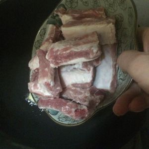 锅水油烧到七成热,下姜片爆香,倒入排骨。