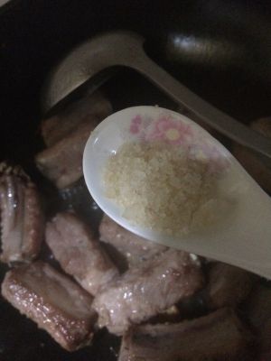 排骨入锅,将蒜、葱放入锅中,适当调至中火